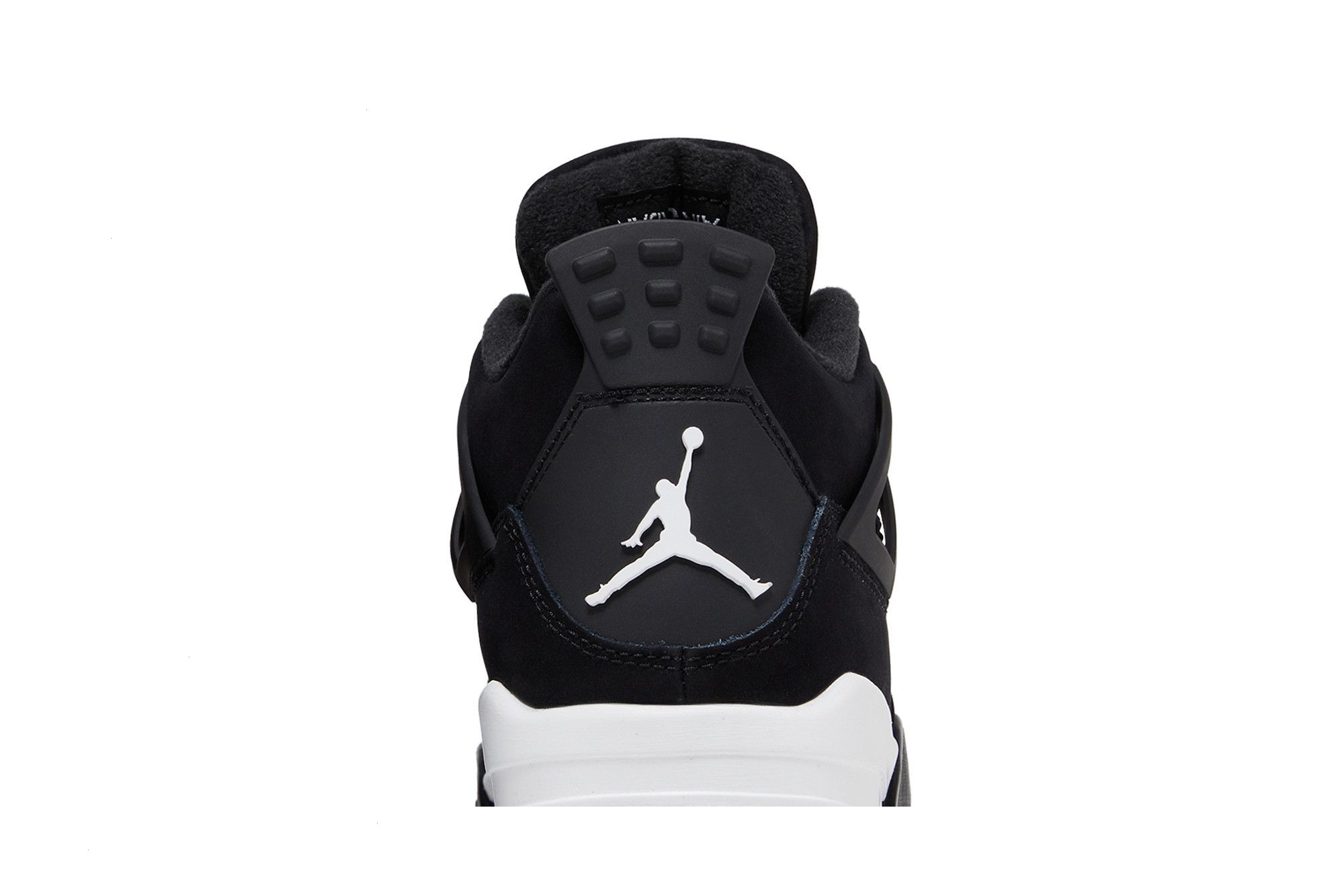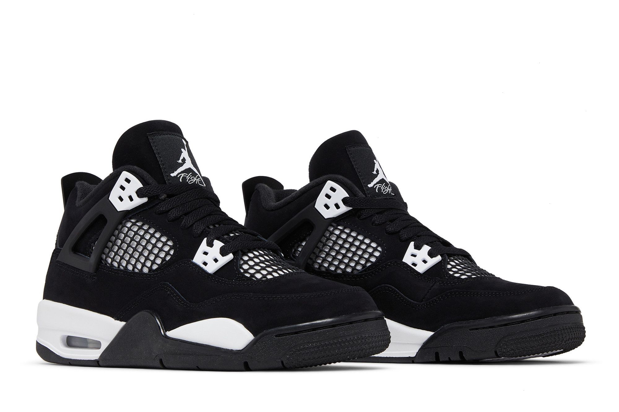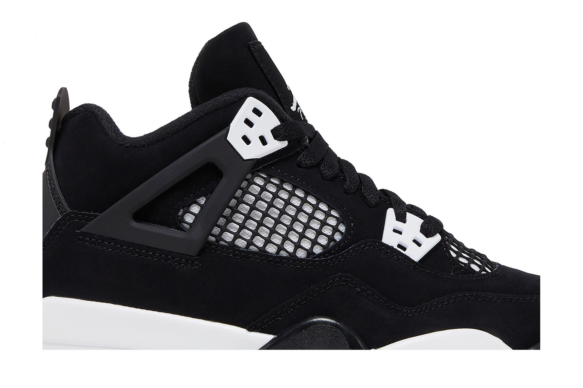 Built for big kids, the Air Jordan 4 Retro GS ‘White Thunder’ showcases color blocking that similar to the original ‘Thunder’ release from 2006. The classic silhouette sports a black nubuck upper with contrasting white accents on the mesh quarter panel, overlaid with black netting, and molded TPU eyelets. White Jumpman branding appears on the woven tongue tag and back heel. The sneaker rides atop a white polyurethane midsole with visible Air-sole cushioning.