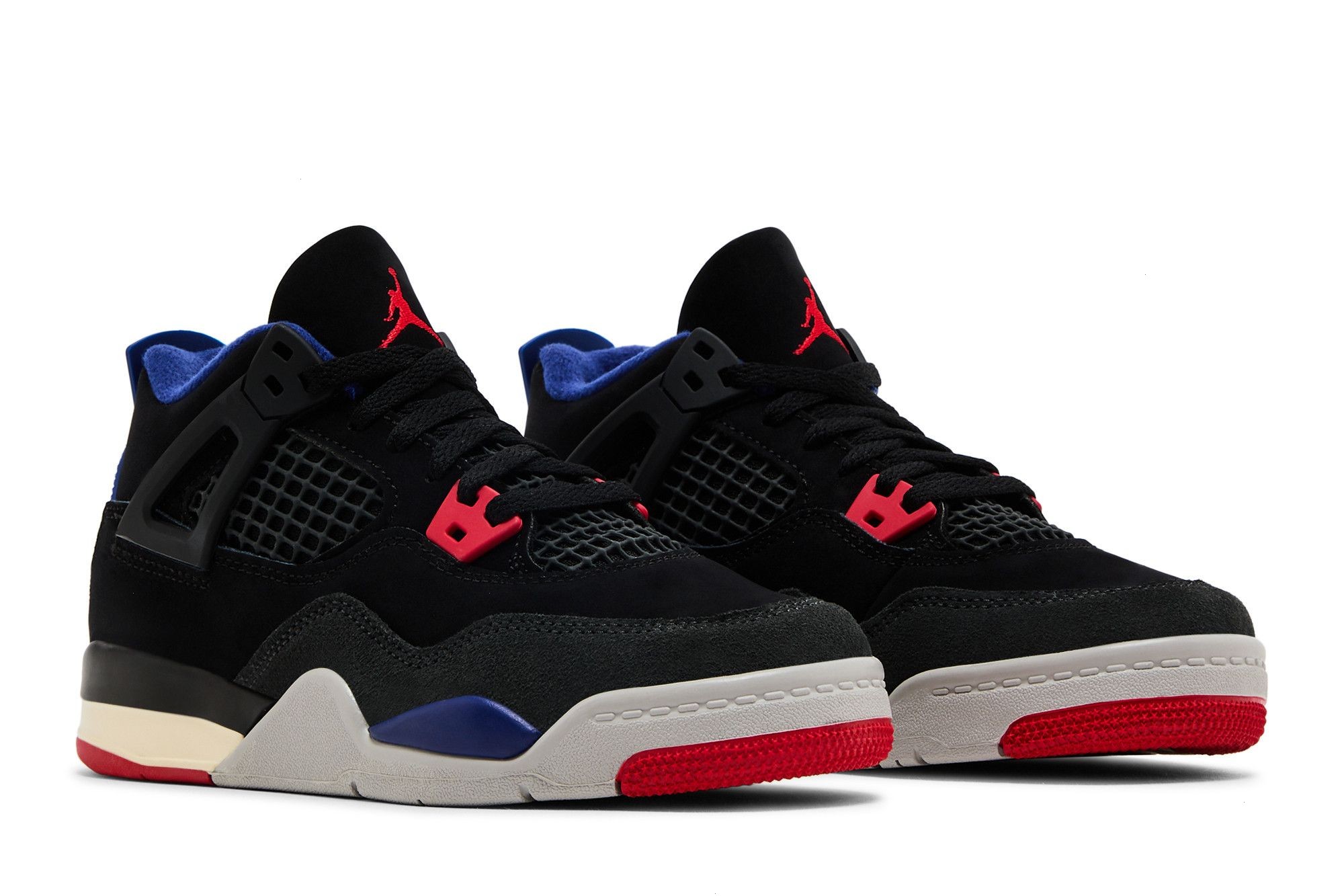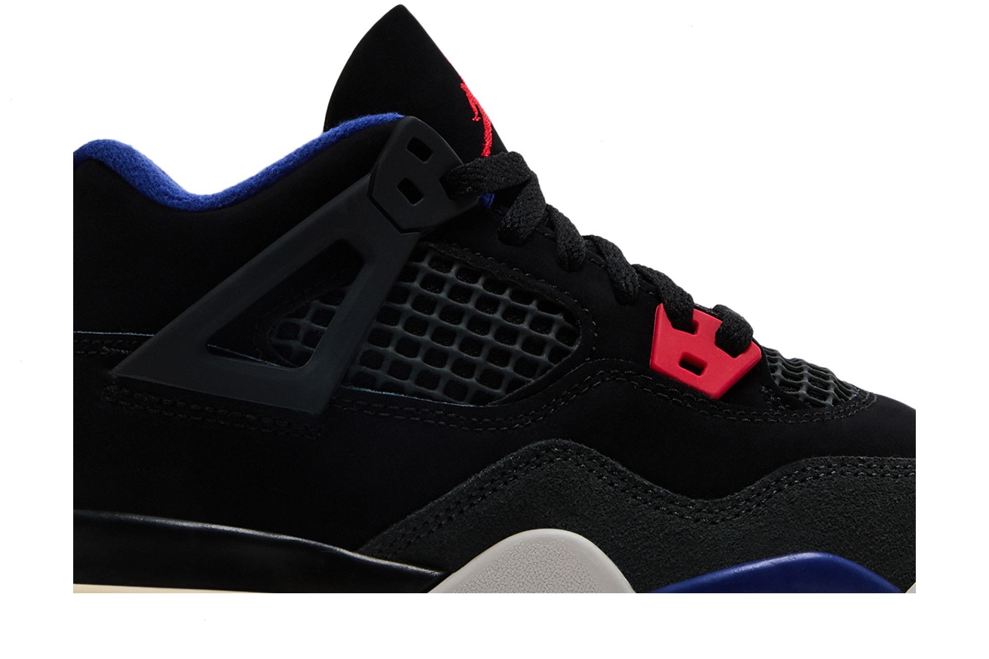 Offered in preschool sizing, the Air Jordan 4 Retro PS ‘Rare Air’ makes use of a black nubuck upper with a suede forefoot overlay in dark grey. The neutral design is contrasted by primary-colored accents, including crimson molded eyelets and a royal blue heel tab marked with raised Nike branding. An embroidered Jumpman in Fire Red graces the tongue.
