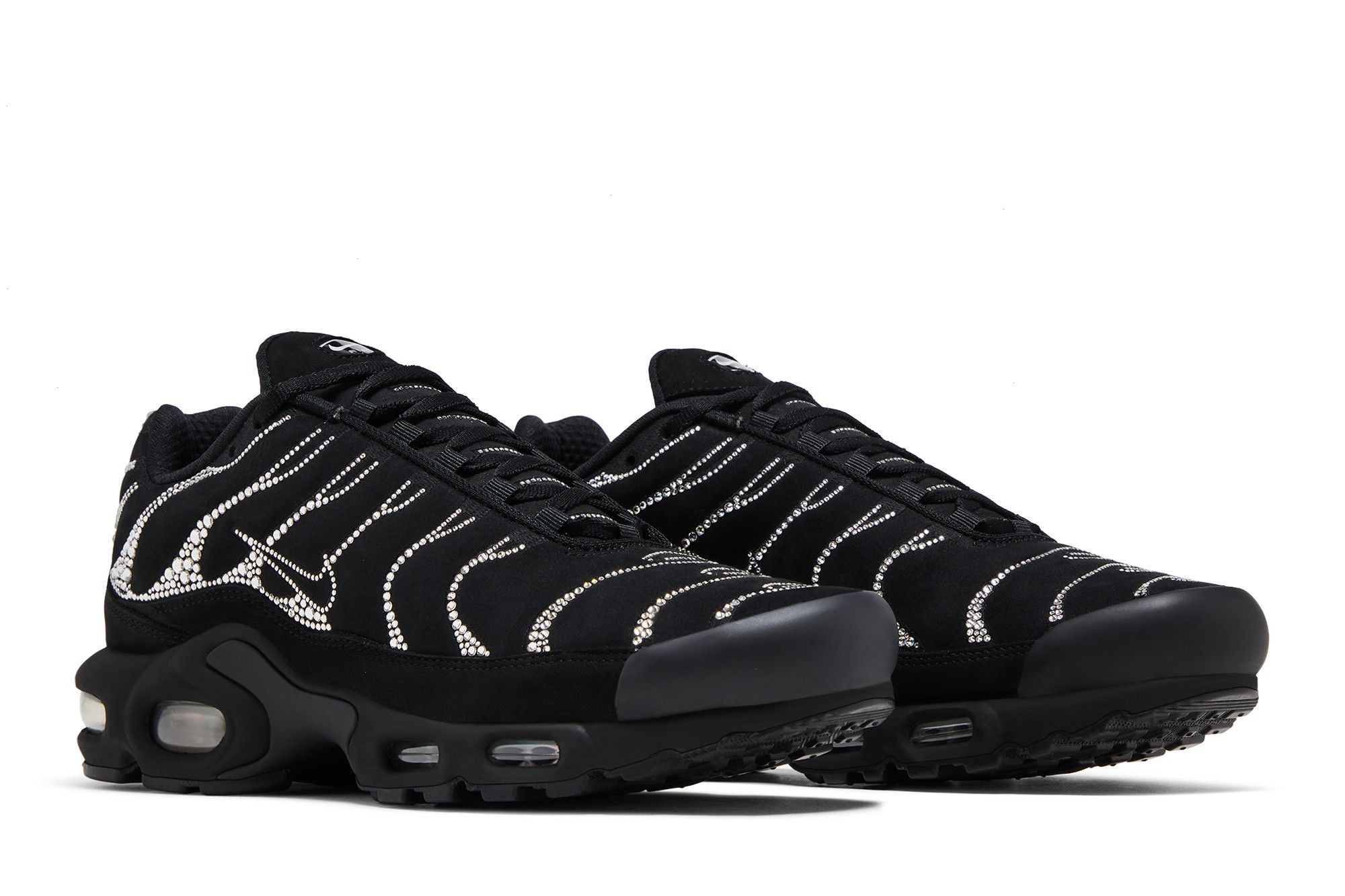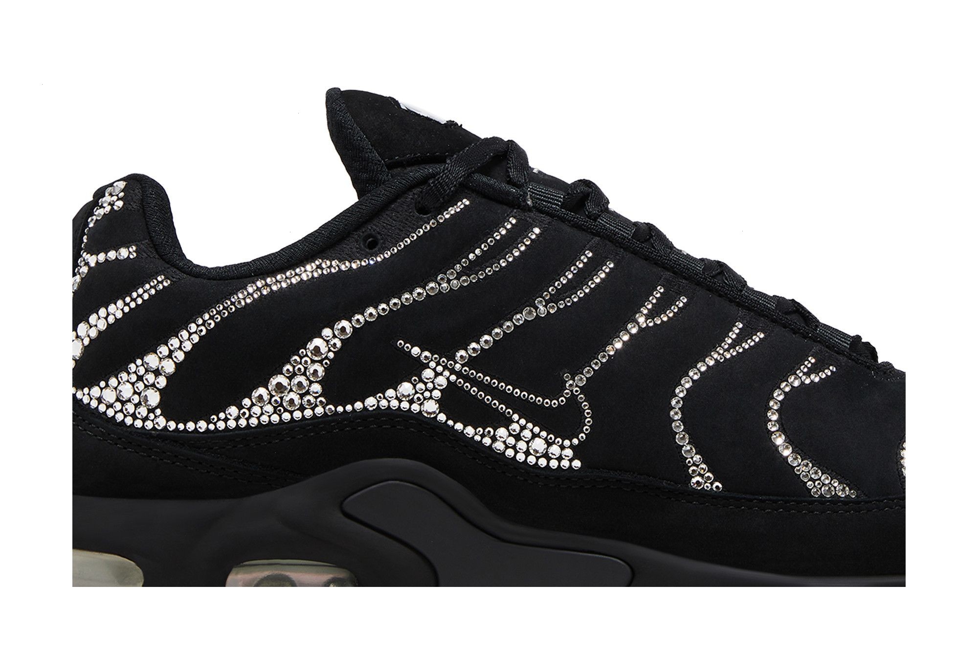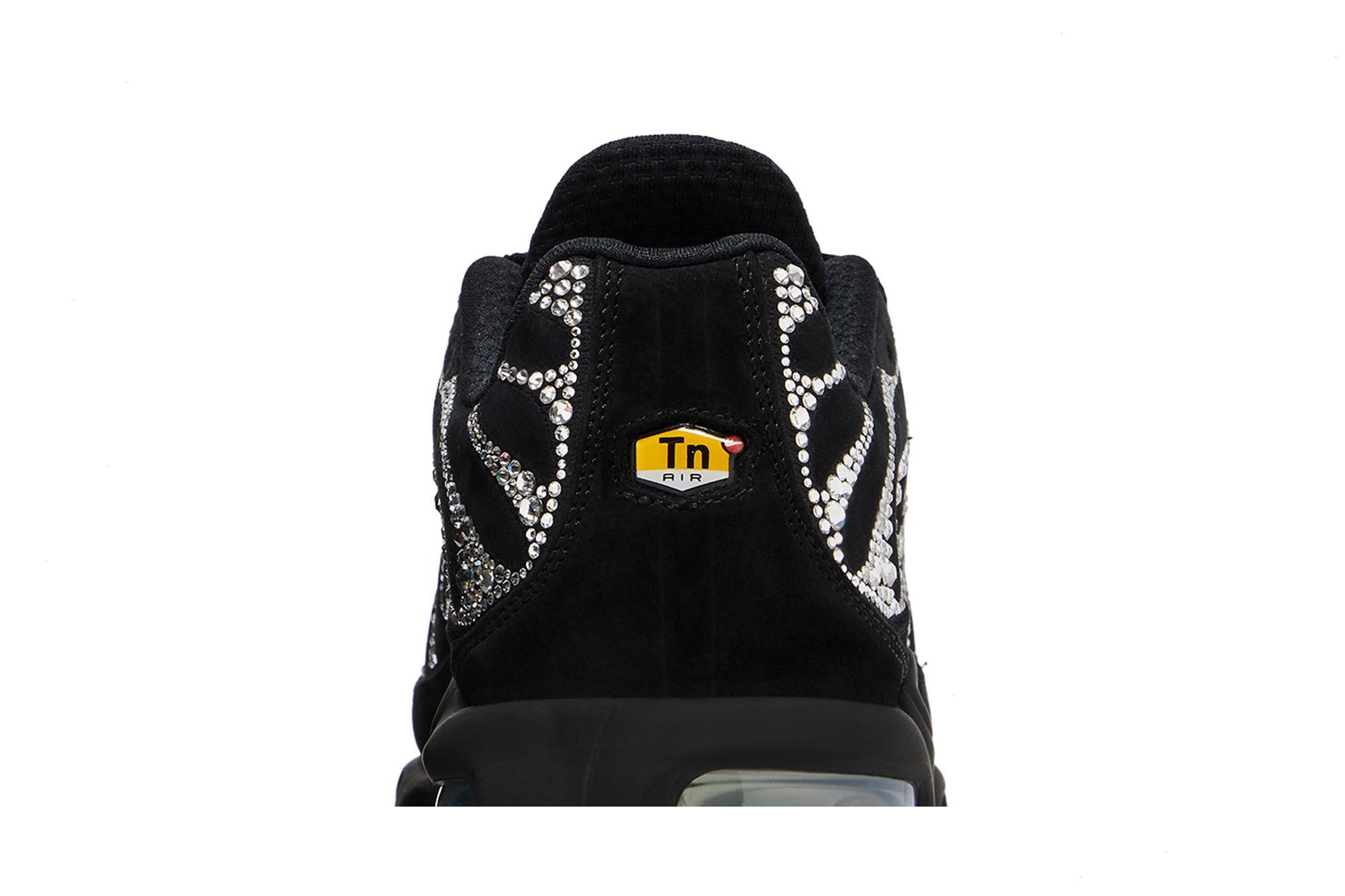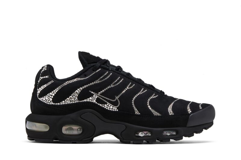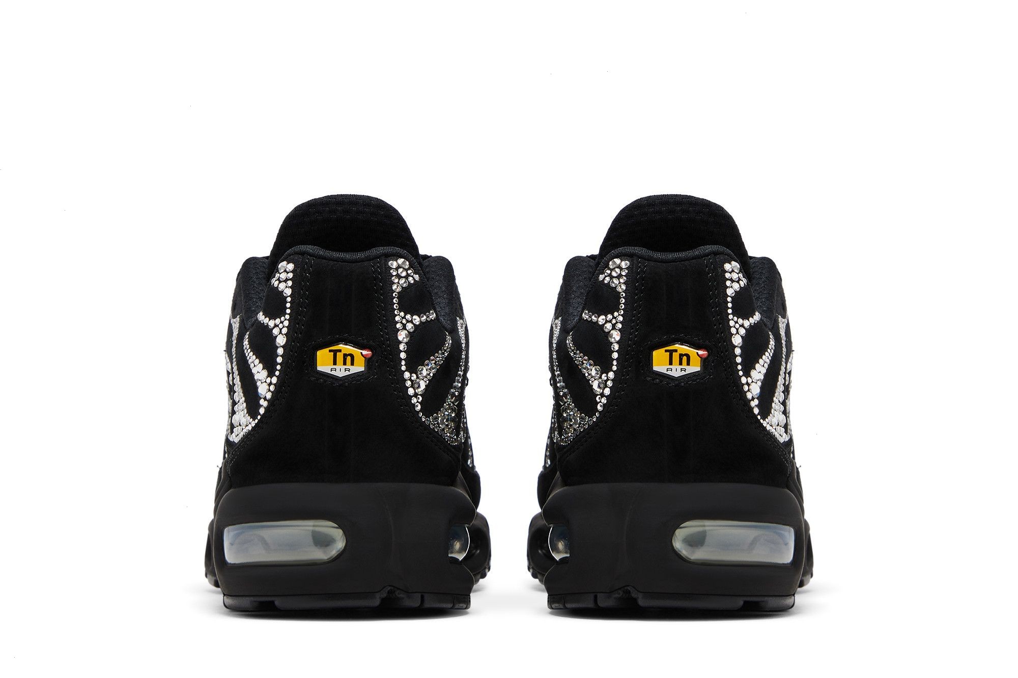 The Swarovski x Nike Women’s Air Max Plus ‘Moonlight’ is built with black leather, featuring signature wavy overlays formed with Swarovski crystals in a moonlight-inspired mosaic. A mini-Swoosh outlined in encrusted crystals adorns the quarter panel, while a Tn Air badge graces the back heel. The sneaker rides atop a matching black polyurethane midsole with visible Air-sole cushioning and a prominent TPU shank.